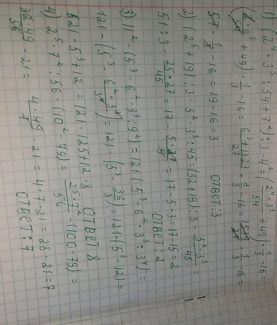 1)сам пример=(16•27:54+49):3-16=3
