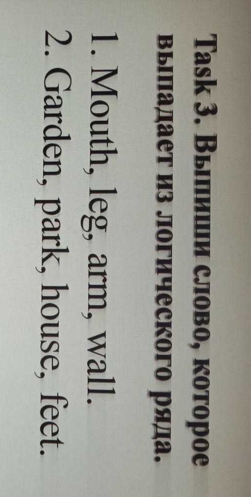 1) Рот, нога, рука, стена. Слово 'стена' выпадает из логического ряда.