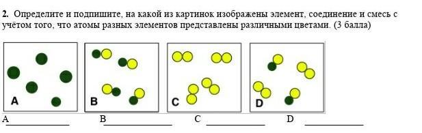 2. Определите и подпишите, на какой из картинок изображены элемент, соединение и смесь с учётом того, что атомы разных элементов представлены различными цветами.