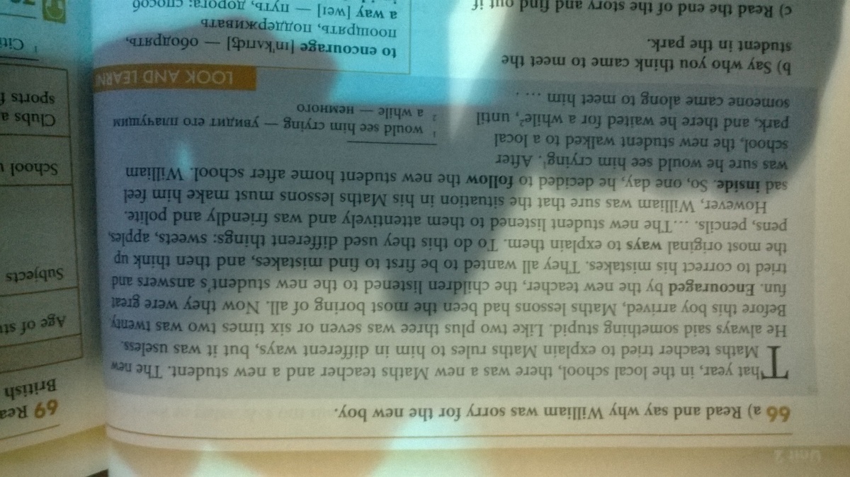 В том же году в местной школе , появился новый учитель математики и новый ученик. Новый учитель математики пытался по-разному объяснить ему правила математики, но это было бесполезно . Он всегда говорил что-то глупое . Например, два плюс три было семь или шестью два было двадцать . До того как этот мальчик приехал, уроки математики были самыми скучными из всех. Теперь они были большим удовольствием. Воодушевленные новым учителем, дети слушали ответы нового ученика и старались исправитьего ошибки . Каждый хотел первым найти ошибки , а затем придумать самые оригинальные способы для объяснения их. Для этого они использовали разные вещи : конфеты, яблоки, ручки, карандаши . ... Новый ученик слушал их внимательно и был доброжелательным и вежливым. Тем не менее, Уильям был уверен , что ситуация в его уроках по математике заставляла его чувствовать себя грустно. Так ,однажды он решил проводить нового ученика домой после школы . Уильям был уверен, что увидит его плачущим. После школы новый ученик пошел в местный парк , и там он ждал немного, пока кто-то не пришел, чтобы встретиться с ним ...