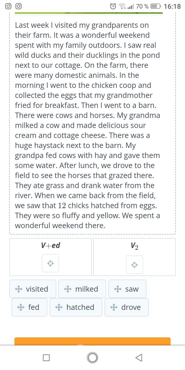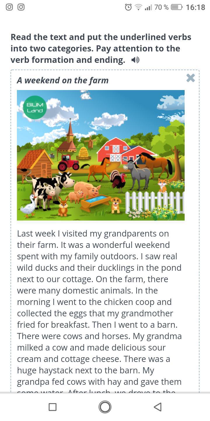 Last week I visited my grandparents on their farm. It was a wonderful weekend spent with my family outdoors. I saw real wild ducks and their ducklings in the pond next to our cottage. On the farm, there were many domestic animals. In the morning I went to the chicken coop and collected the eggs that my grandmother fried for breakfast. Then I went to a barn. There were cows and horses. My grandma milked a cow and made delicious sour cream and cottage cheese. There was a huge haystack next to the barn. My grandpa fed cows with hay and gave them some water. After lunch, we drove to the field to see the horses that grazed there. They ate grass and drank water from the river. When we came back from the field, we saw that 12 chicks hatched from eggs. They were so fluffy and yellow. We spent a wonderful weekend there.