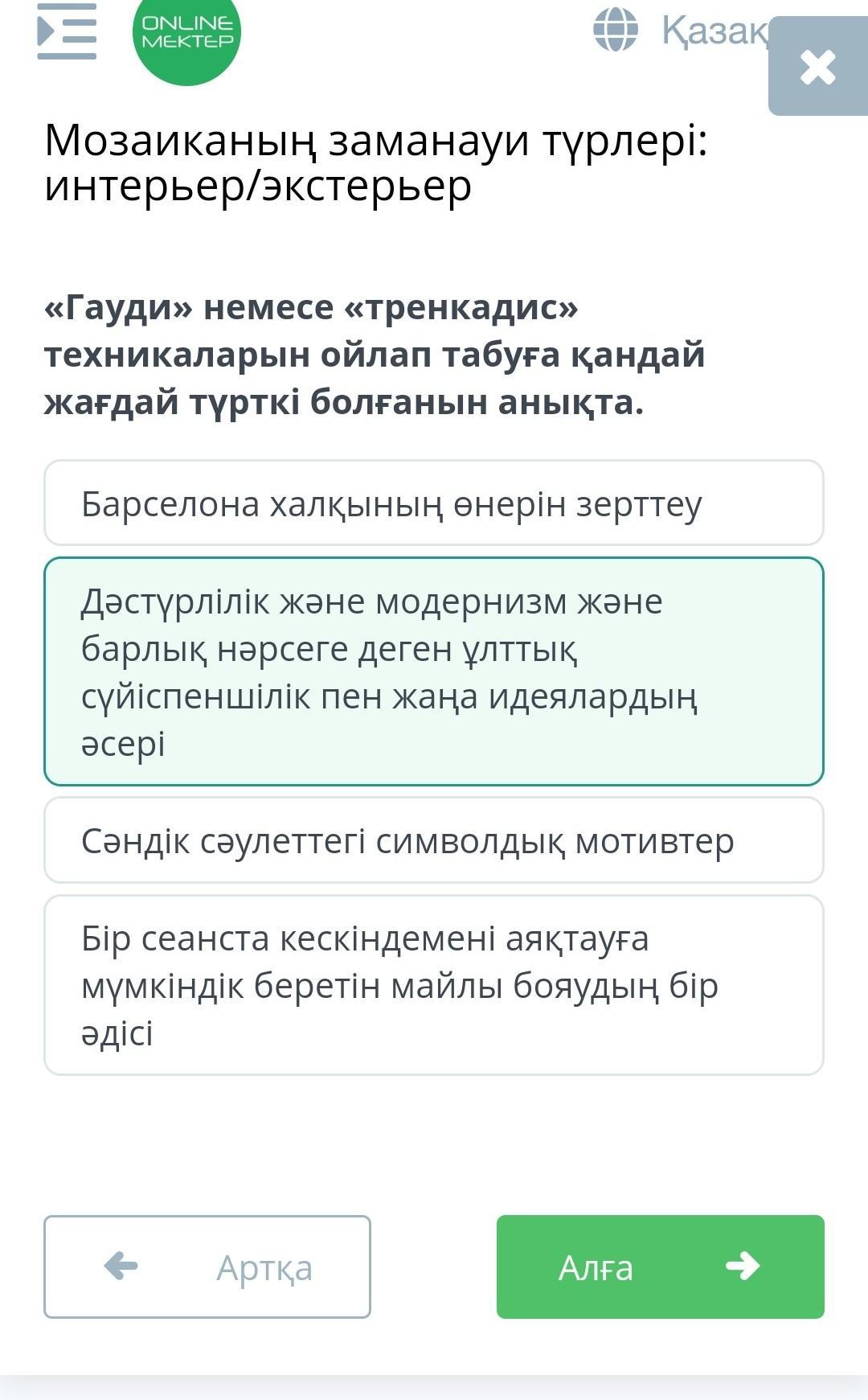 «Гауди» немесе «тренкадис» техникаларын ойлап табуға қандай жағдай түрткі болғанын анықта. Барселона халқының өнерін зерттеу Бір сеанста кескіндемені аяқтауға мүмкіндік беретін майлы бояудың бір әдісі Дәстүрлілік және модернизм және барлық нәрсеге деген ұлттық сүйіспеншілік пен жаңа идеялардың әсері Сәндік сәулеттегі символдық мотивтер