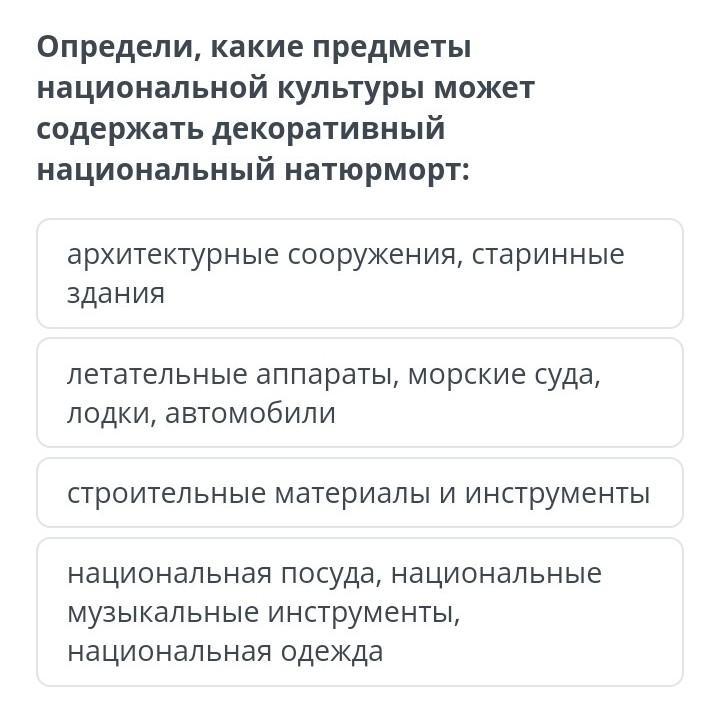 Определи, какие предметы национальной культуры может содержать декоративный национальный натюрморт: