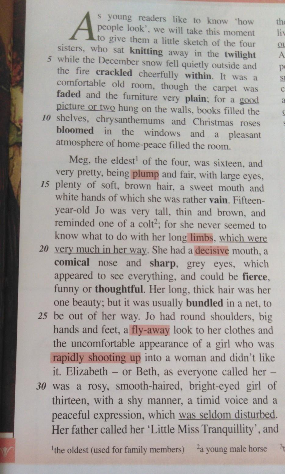 Поскольку юные читатели хотят знать, «как люди выглядят», мы воспользуемся моментом, чтобы дать им небольшой набросок четырех сестер, которые сидели и вязали в сумерках, пока декабрьский снег тихо падал снаружи и огонь весело потрескивал внутри. это была удобная старая комната, хотя ковер был выцветшим, а мебель очень простой; из-за того, что на стенах повесили пару хороших картин, книги заполнили полки, в окнах расцвели хризантемы и рождественские розы, и наполнилась приятная атмосфера домашнего уюта. Мэг, старшей из четырех, было шестнадцать, и она была очень хорошенькой, пухленькой и светлой, с большими глазами, густыми мягкими каштановыми волосами, милым ртом и белыми руками, в которых она была довольно тщеславной. -летняя Джо была очень высокой, худой и смуглой и напоминала жеребенка?; поскольку она, казалось, никогда не знала, что делать со своими длинными конечностями, которые сильно мешали ей. У нее был решительный рот, смешной нос и острые серые глаза, которые, казалось, видели все и могли быть свирепыми е, смешно или задумчиво. Ее единственной красотой были длинные густые волосы; но обычно его связывали сеткой, чтобы она не мешала. У Джо были круглые плечи, большие руки и ноги, расплывчатый вид ее одежды и неудобный вид девушки, которая быстро бросалась в женщину и ей это не нравилось. Элизабет - или Бет, как все ее называли, была розовой, гладковолосой и ясноглазой девушкой тринадцати лет, с застенчивыми манерами, робким голосом и мирным выражением лица, которое редко беспокоили. Ее отец называл ее «Маленькая мисс Спокойствие» и «старейший (используемый для членов семьи) молодой самец.