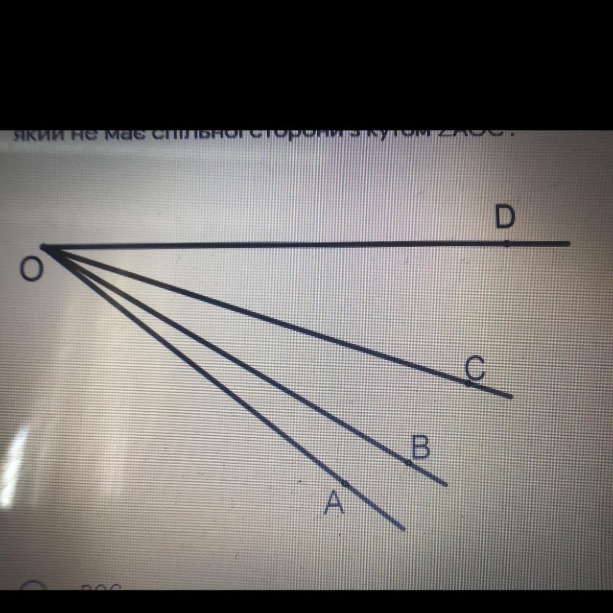 Промені OA, OB, OC і OD виходять зі спільної точки O. Назви кут, який не має спільної сторони з кутом AOС