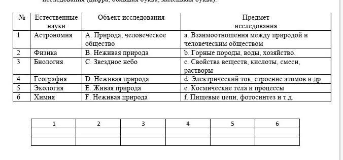 установи соответствие: естественная наука - объект исследования - предмет исследования (цифра, большая буква, маленькая буква)