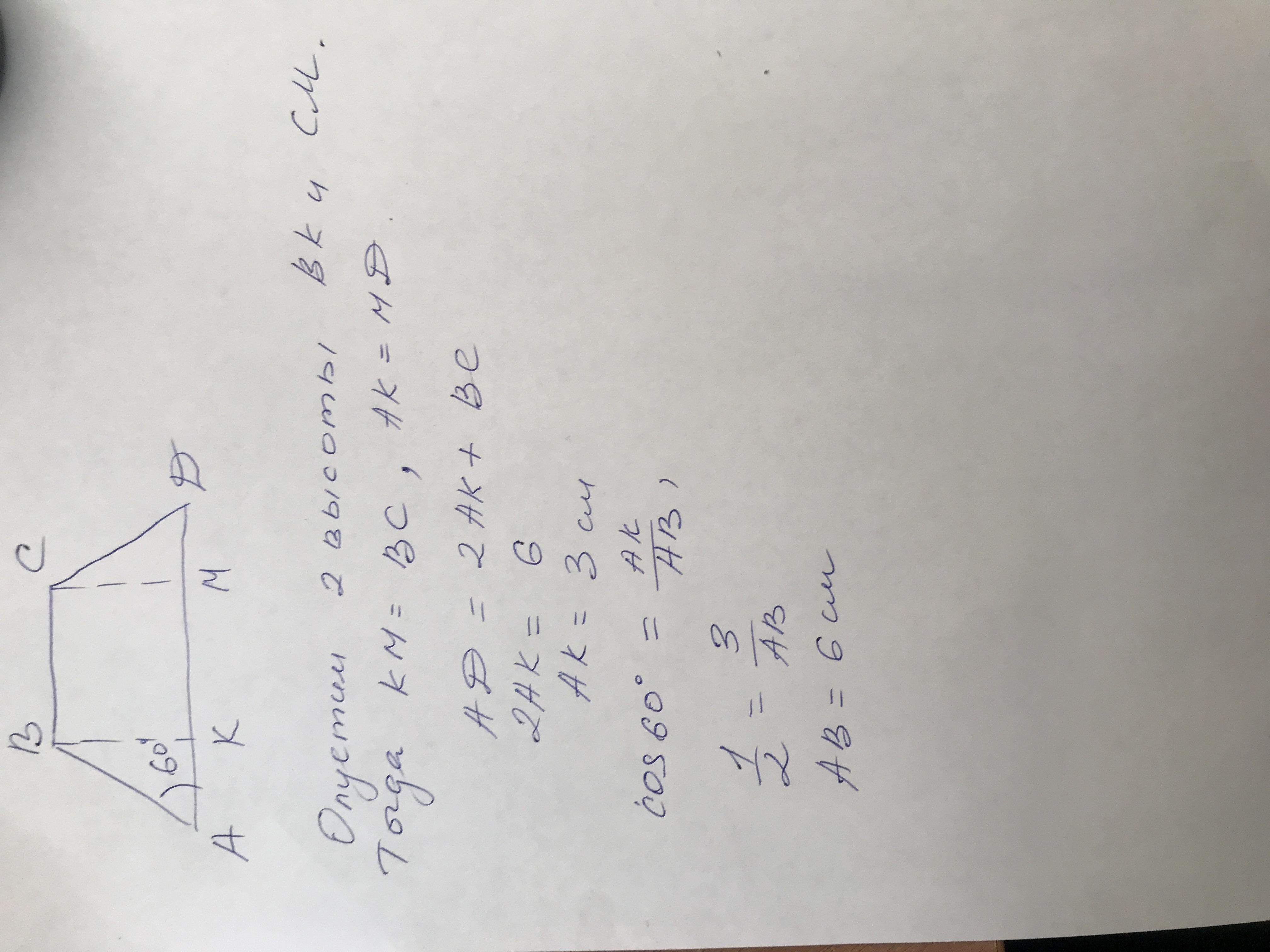 в равнобедренный трапеции основания равны 9 см и 15 см. найдите боковую сторону трапеции если её острый угол равен 60