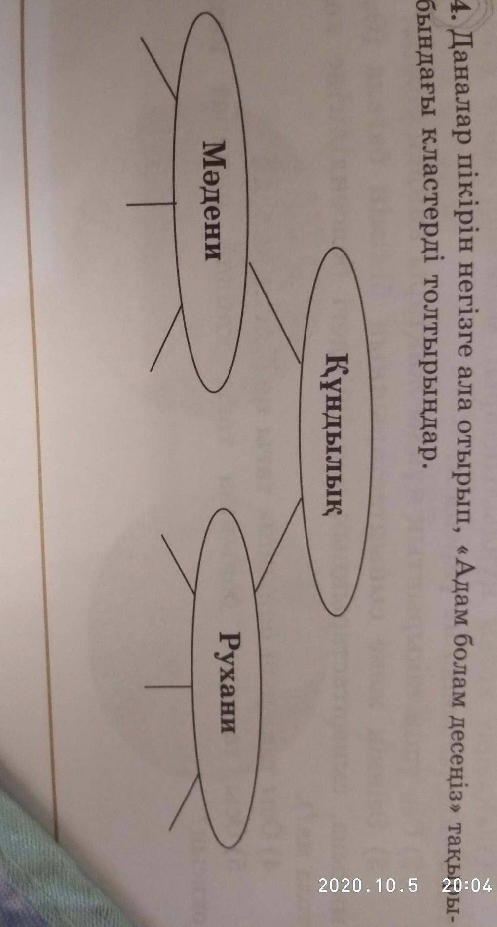 Рухани құндылықтар:адами тәртіп ,мінез- құлық, ұлттық көзқарас , тәрбие, ақыл-ой ,қайырымдылық жасау т.б