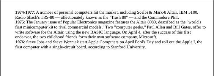 Оршаға аударылым: 1974-1977: На рынке появилось несколько персональных компьютеров, в том числе Scelbi & Mark-8 Altair, IBM 5100, TRS-80 Radio Shack, ласково известный как "Trash 80", и Commodore PET. 1975: В январском номере журнала Popular Electronics представлен Altair 8080, названный «первым в мире комплектом миникомпьютеров, способным конкурировать с коммерческими моделями». Два «компьютерных фаната», Пол Аллен и Билл Гейтс, предлагают написать программное обеспечение для Altair, используя новый язык BASIC. 4 апреля, после успеха этого первого начинания, двое друзей детства основали собственную компанию по разработке программного обеспечения Microsoft. 1976: Стив Джобс и Стив Возняк запускают Apple Computers в День дурака и выпускают Apple I, первый компьютер с одноконтурной платой, согласно Стэнфордскому университету.