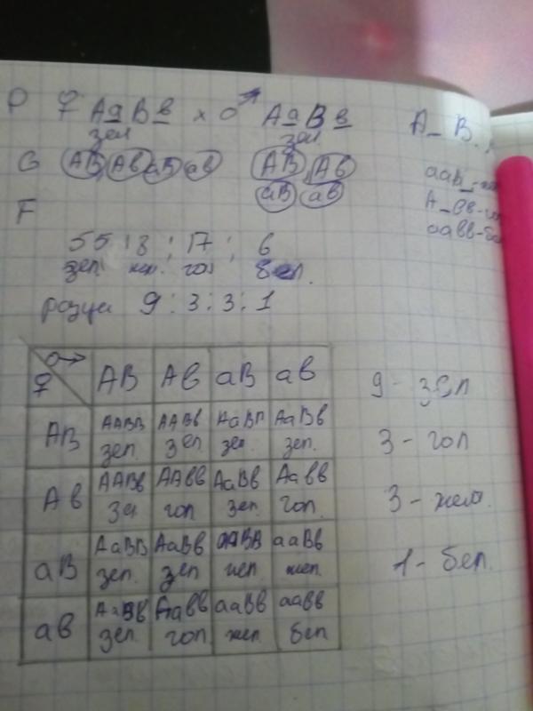 F1: AaBB (зеленая окраска) AaB_ (зеленая окраска) _аBB (возможна как зеленая, так и голубая окраска) аaBb (голубая окраска)