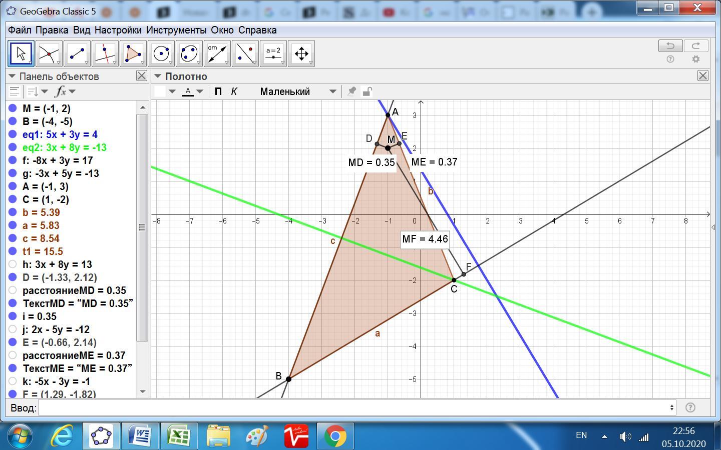 d = |A•Mx + B•My + C| / √(A2 + B2).