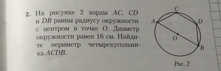 Диаметр окружности АВ равен 16 см, но он также и является 1 стороной четырехугольника АВСD . Нам известно что АС, СD, DB равны радиусу диаметра, а радиус это половина диаметра, то есть нужно 16см:2=8см. Так мы узнаем, что АС, СD,DB=8см. Чтобы получить периметр, нужно сложить все стороны четырехугольника: Р=8см+8см+8см+16см=40см