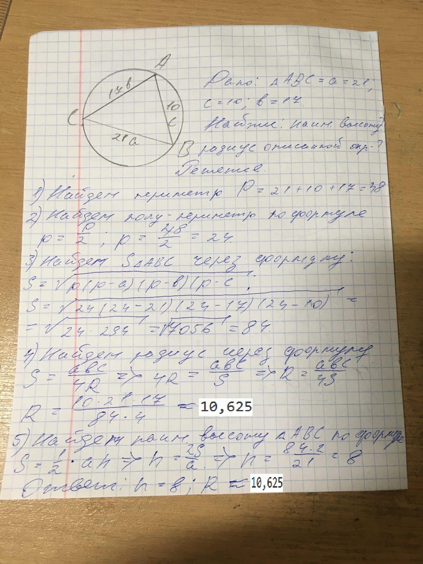 найдите наименьшую высоту и радиус описанной окружности для треугольника со сторонами 10.17 и 21 помогите пожалуйста и рисунок то же!