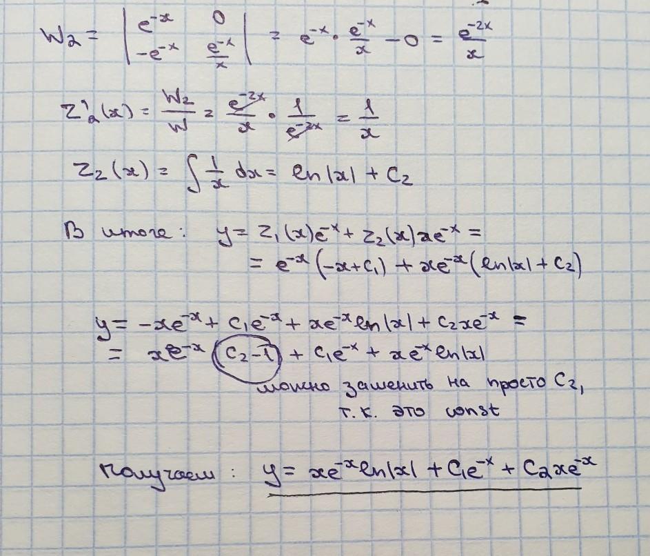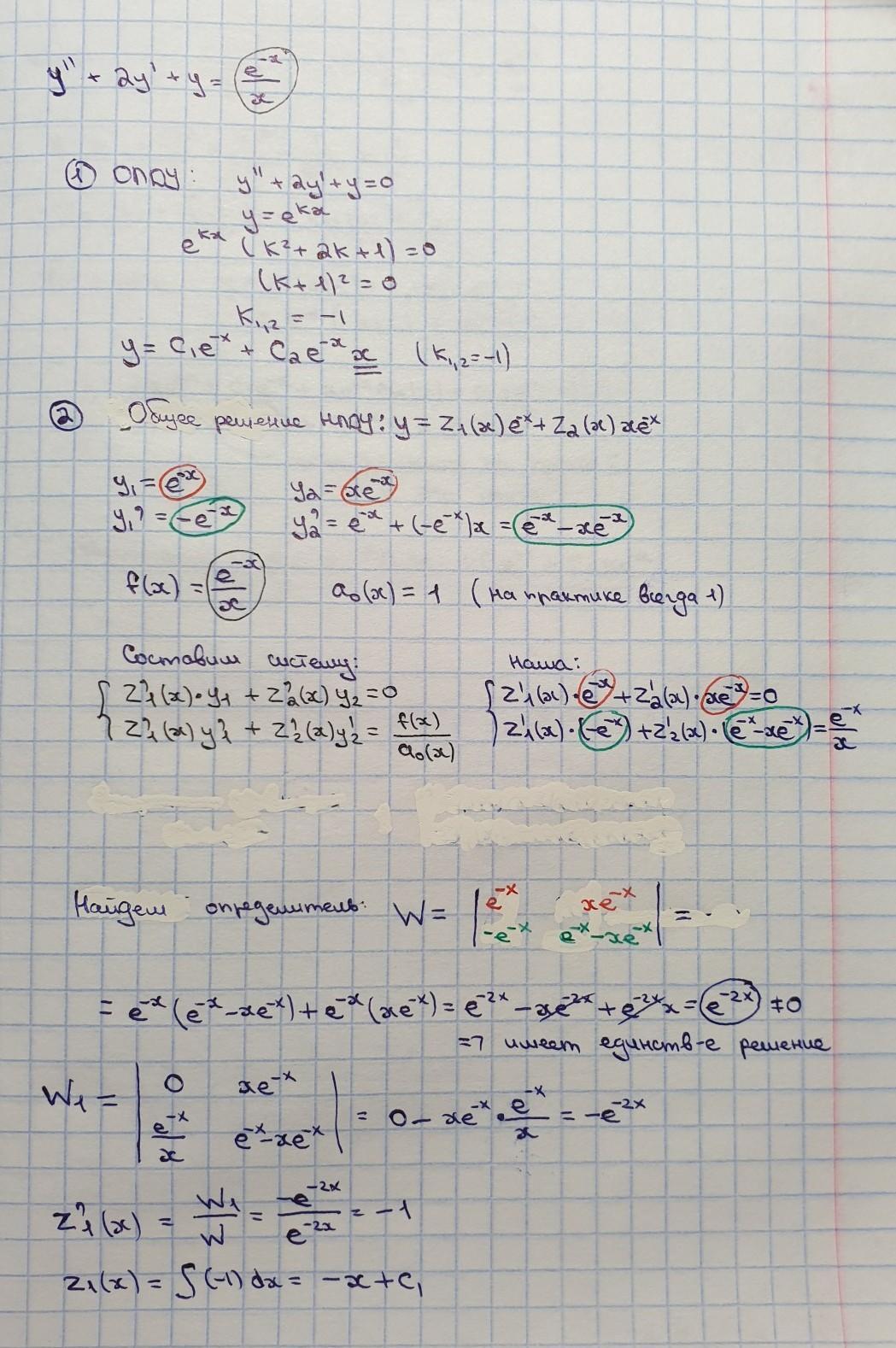 Решите пожалуйста, даю 80 баллов. Найти решение дифференциального уравнения: y''+2y'+y=e^-x/x Не через калькулятор и как можно подробнее.