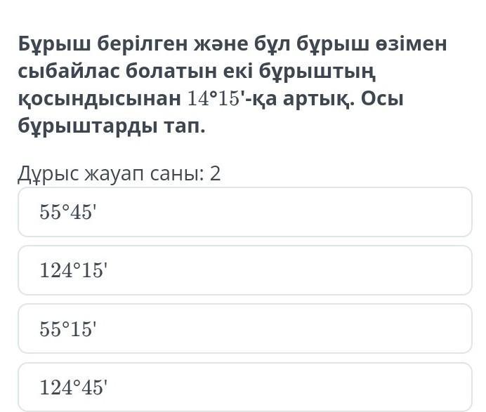 Бұрыш берілген және бұл бұрыш өзімен сыбайлас болатын екі бұрыштың қосындысынан 14°15'-қа артық. Осы бұрыштарды тап.