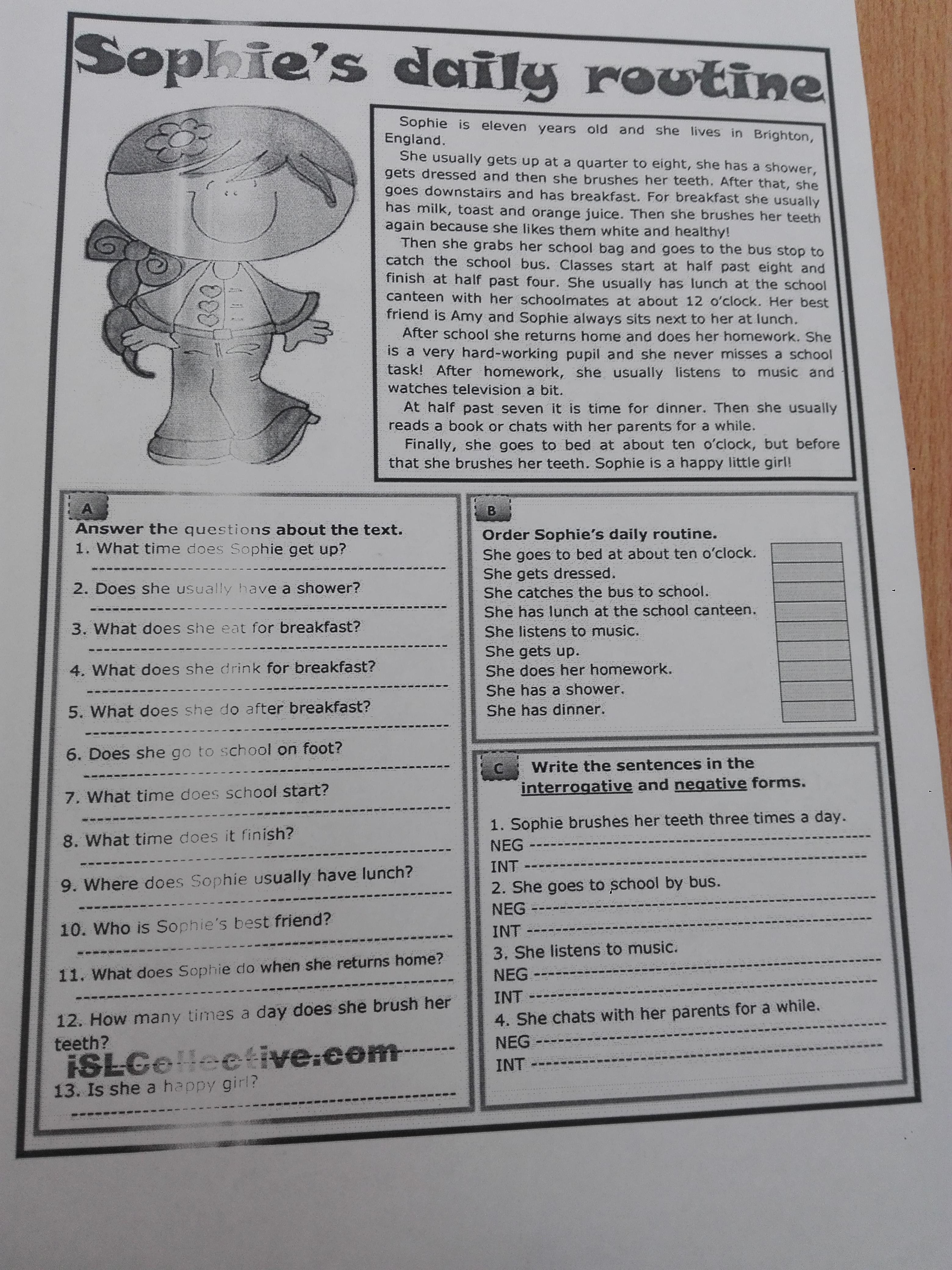 1)quarter to eight 2)yes 3)toast 4)milk and orange juice 5)brushes her teeth again