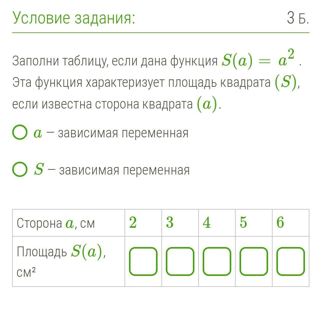 Эта функция характеризует площадь квадрата (S) , если известна сторона квадрата (a) .