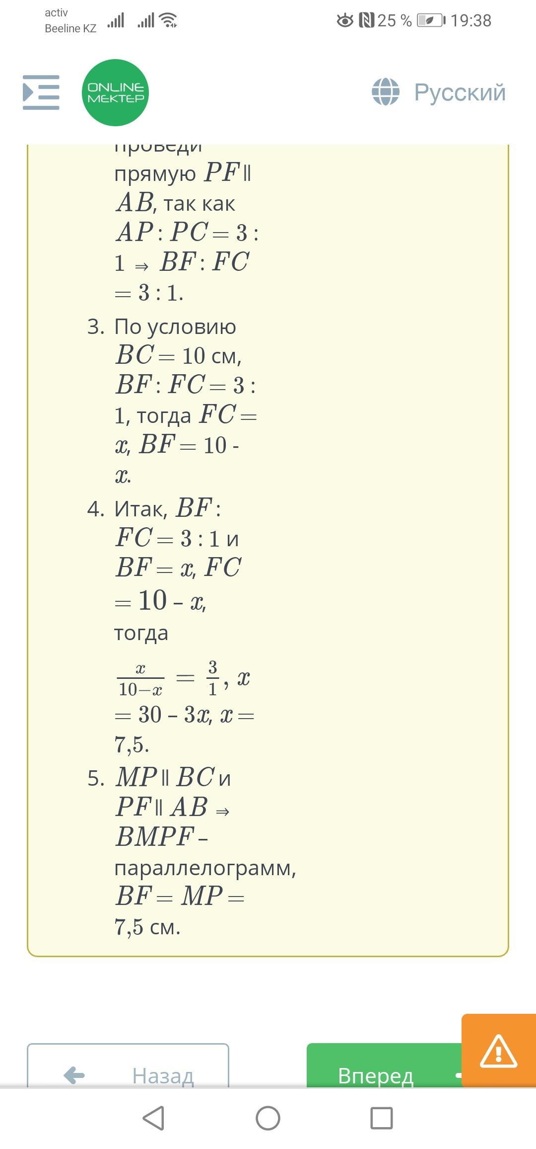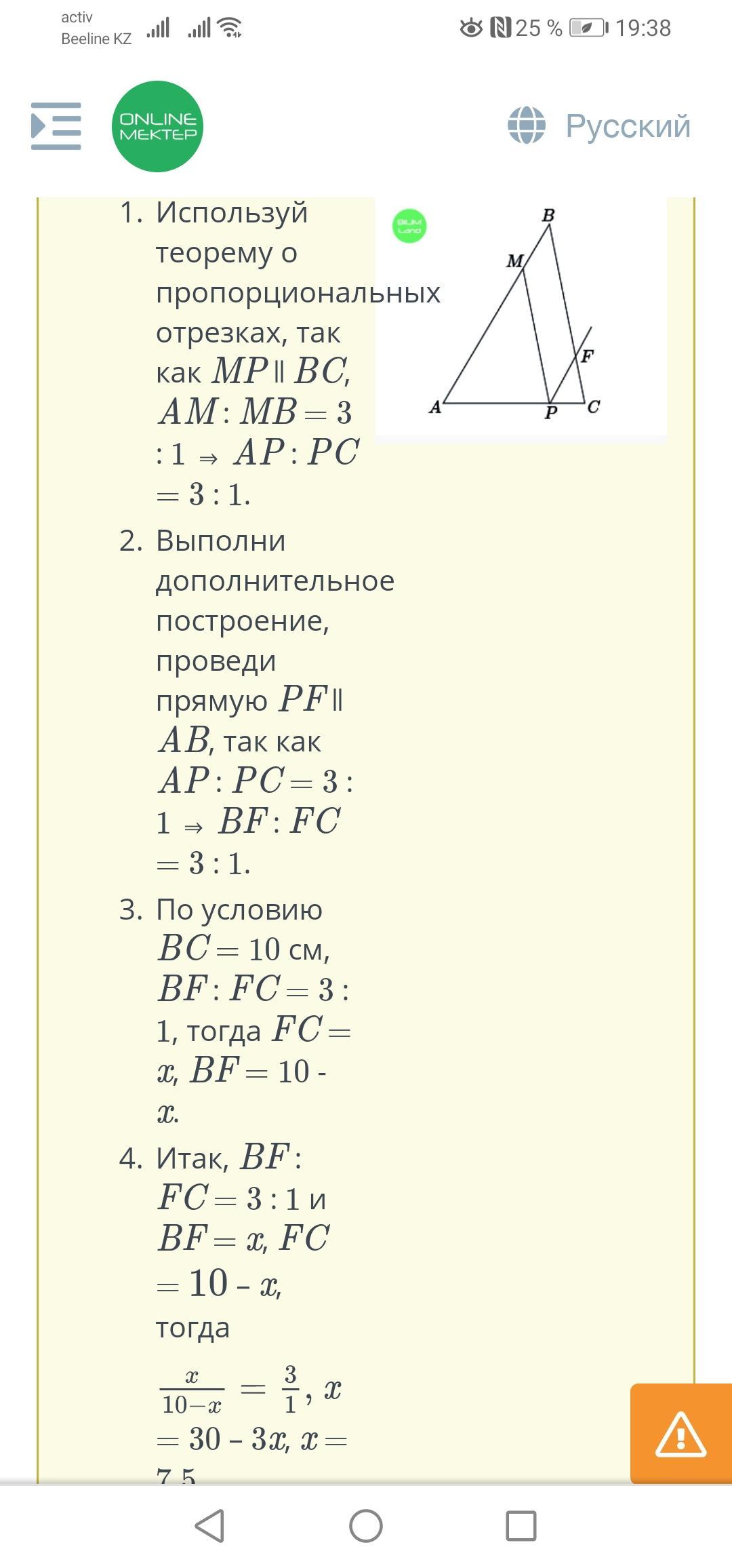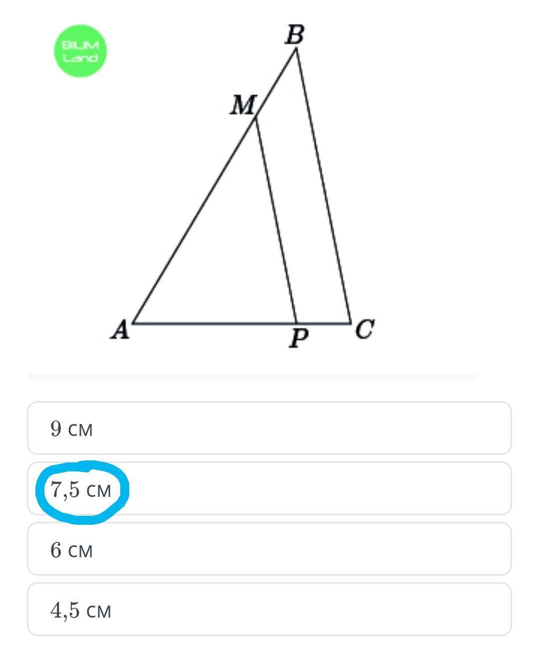 На рисунке в ∆ABC: BC = 10 см, MP || BC, AM : MB = 3 : 1. Найди длину отрезка MP. (Ответ: 7,5 но можно со объяснением?... Пожалуйста)