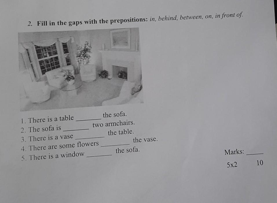 2. Fill in the gaps with the prepositions: in, behind, between, on, in front of