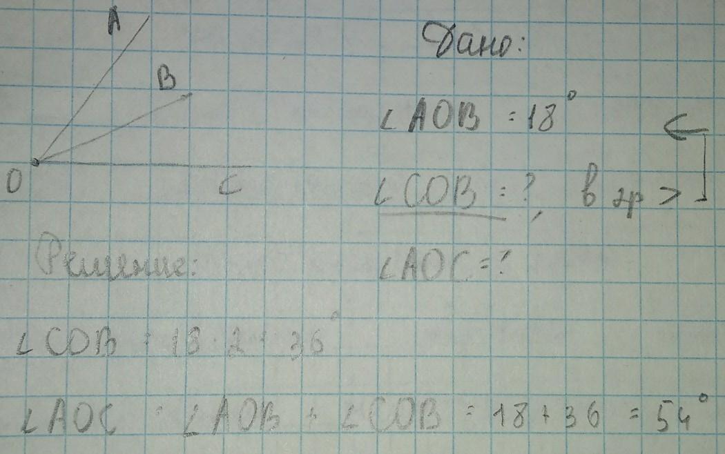 Начертите угол aoc внутри угла Проведите Луч OB Найдите величину угла aoc если угол АОВ= 18⁰ а угол сов в 2 раза больше аоб срооооооочноооо