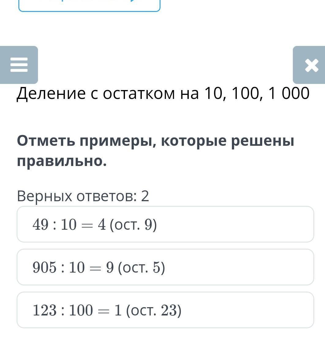 905 ÷ 10 = 9 ( ост. 5 ) - Неправильно. 905 ÷ 10 = 90 ( ост. 5 )