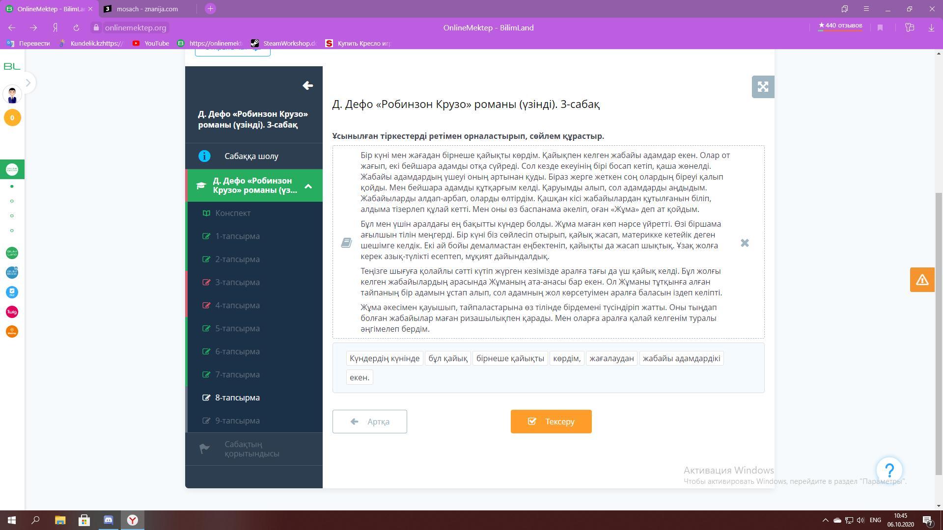 Ұсынылған тіркестерді ретімен орналастырып, сөйлем құрастыр.