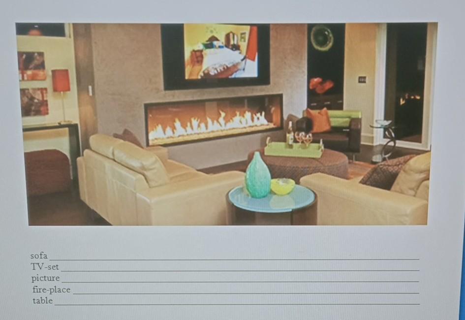 There are 2 sofas. There is one tv-set. There are 2 pictures. There is 1 fireplace. There is 1 table. There is one lamp.