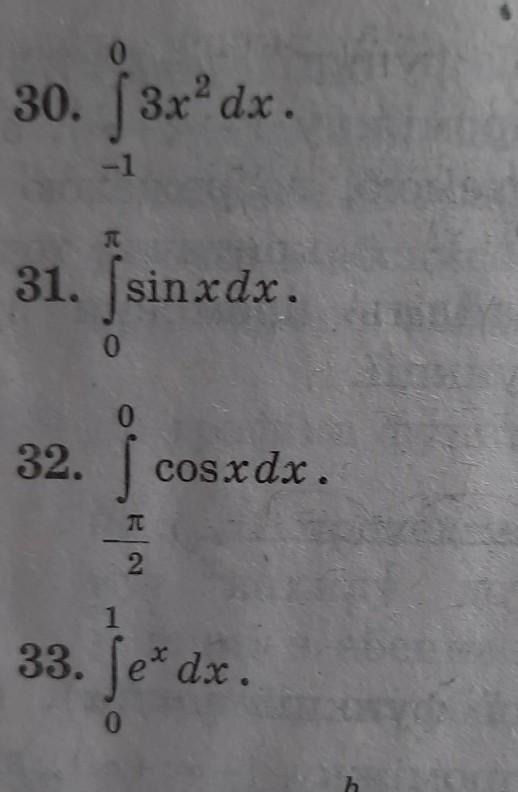 \int\limits^0_{-1}\, 3x^2\, dx=3\cdot \dfrac{x^3}{3}\Big|_{-1}^0=x^3\, \Big|_{-1}^0=0^3-(-1)^3=1\\\\\\\int\limits^{\pi }_0\, sinx\, dx=-cosx\, \Big|_0^{\pi }=-cos\pi +cos0=-(-1)+1=2\\\\\\\int\limits^0_{-\frac{\pi}{2}}\, cosx\, dx=sinx\, \Big|^0_{-\frac{\pi}{2}}=sin0-sin(-\dfrac{\pi}{2})=0-(-1)=1\\\\\\\int\limits^1_0\, e^{x}\, dx=e^{x}\, \Big|_0^1=e^1-e^0=e-1
