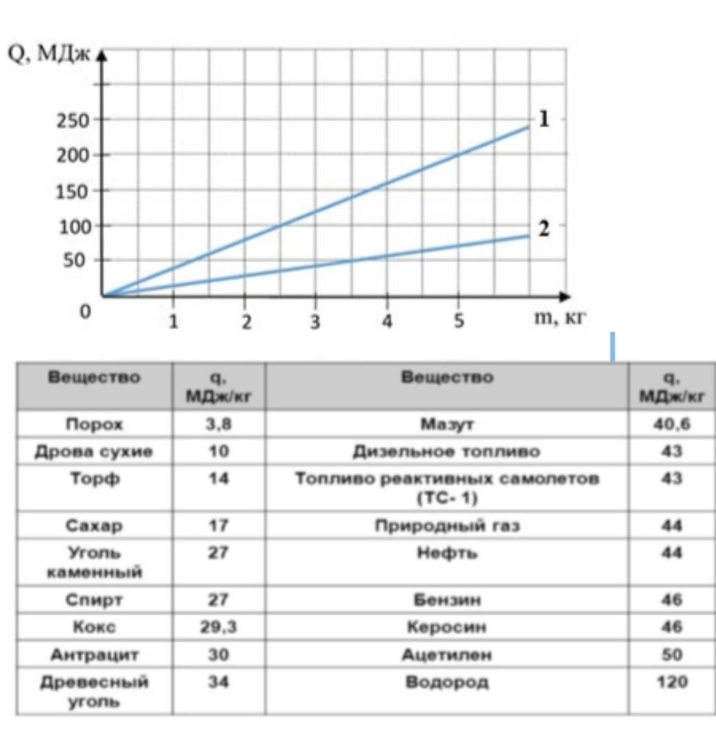Рассмотрите график зависимости количества теплоты, выделяющегося при сгорании топлива, от массы топлива. Определите по таблице, данной ниже, для каких видов топлива эти графики. *