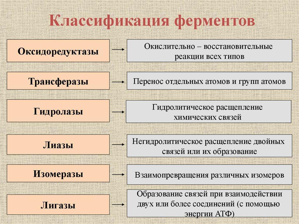 По типу катализируемых реакций ферменты подразделяются на 6 классов согласно иерархической классификации ферментов (КФ, EC — Enzyme Comission code). Классификация была предложена Международным союзом биохимии и молекулярной биологии (International Union of Biochemistry and Molecular Biology). Каждый класс содержит подклассы, так что фермент описывается совокупностью четырёх чисел, разделённых точками. Например, пепсин имеет название ЕС 3.4.23.1. Первое число грубо описывает механизм реакции, катализируемой ферментом: