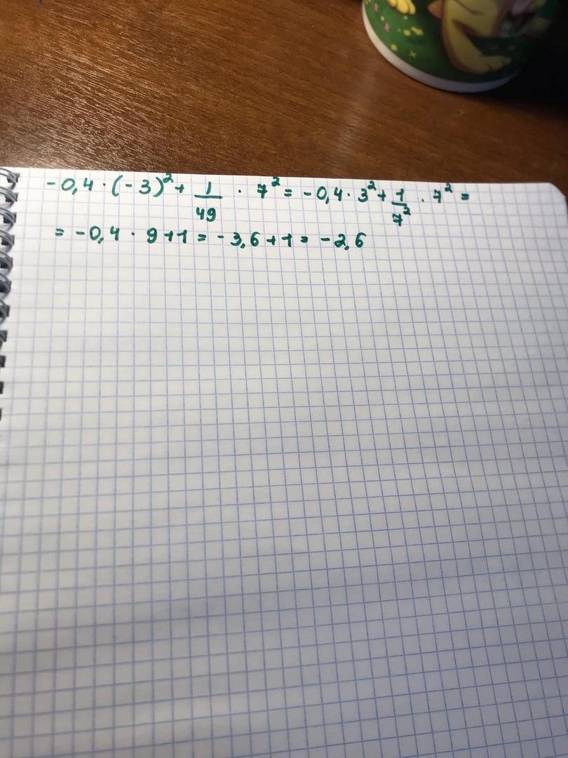 -0.4(-3)²+1/49×7²=-0.4*9+1/49*49= -3.6+1 = -2.6