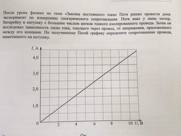 Выберем точку, которую хорошо видно. (4; 10) то есть при токе 4 ампера напряжение 10 вольт. Значит сопротивление равно R=U/I=10/4=2,5 Ом