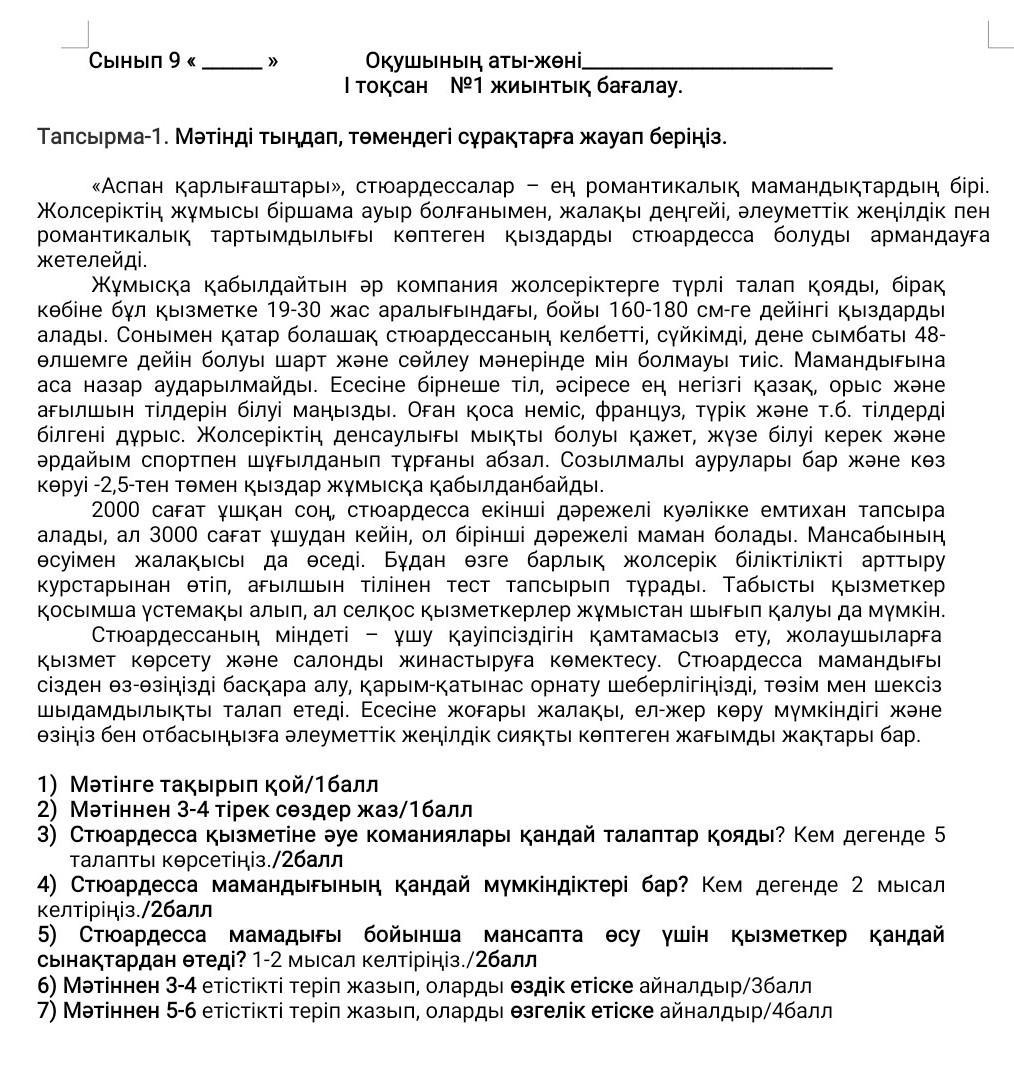 тірек сөздер:жолсерік,ұшақ,стюардесса,ұшу,аспан,маман