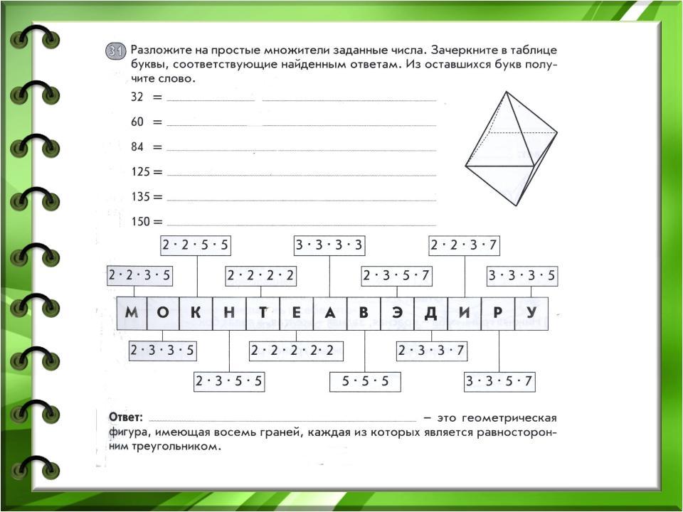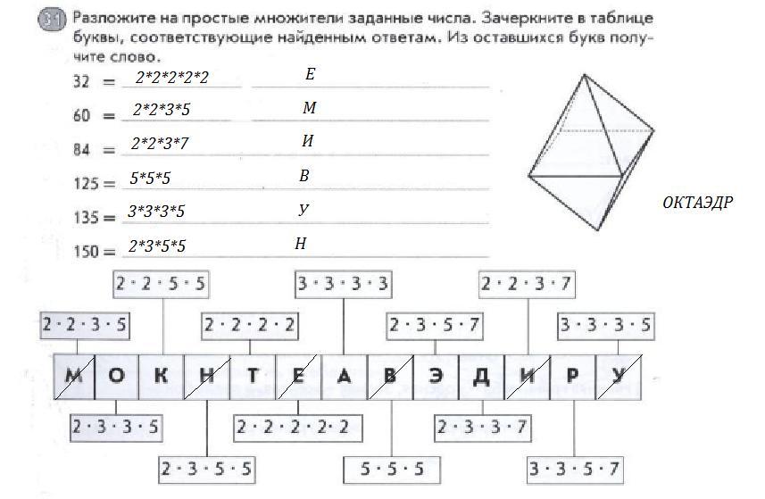 разложить на простые множители заданные числа. зачеркните в таблице буквы, соответствующие найденным ответам. Из оставшихся букв получите слово