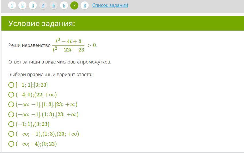 20 баллов.Пожалуйста,помогите те кто шарит в алгебре.Реши неравенство t2−4t+3t2−22t−23>0 .