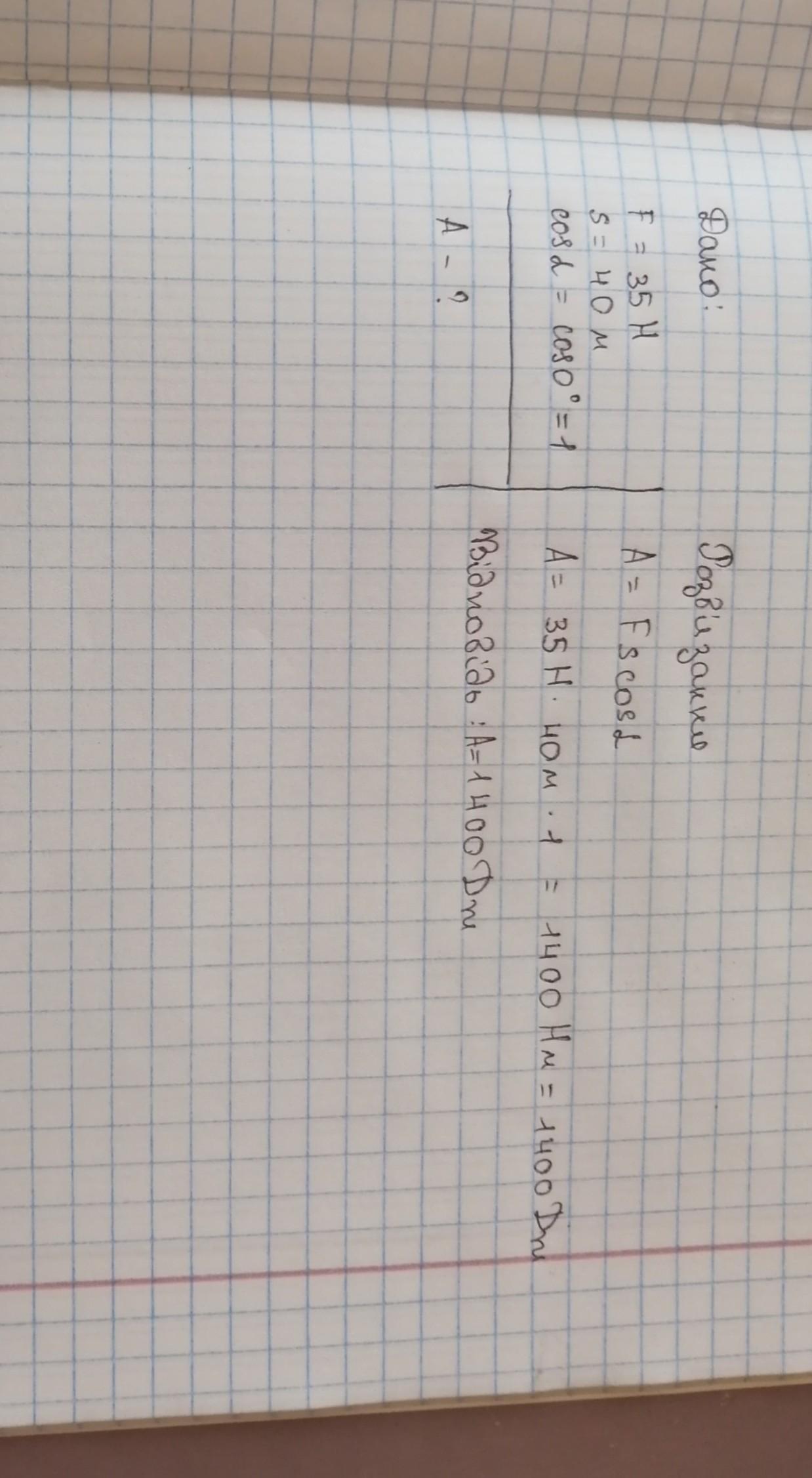 К телу прикладывают силу в 35 \(Н\) и прямолинейно перемещают его на расстояние 40 \(м\). Сила приложена под углом 0° к горизонту.