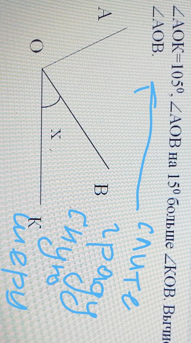 Дано : Угол АОК = 105° , угол АОВ на 15° больше угла КОВ.
