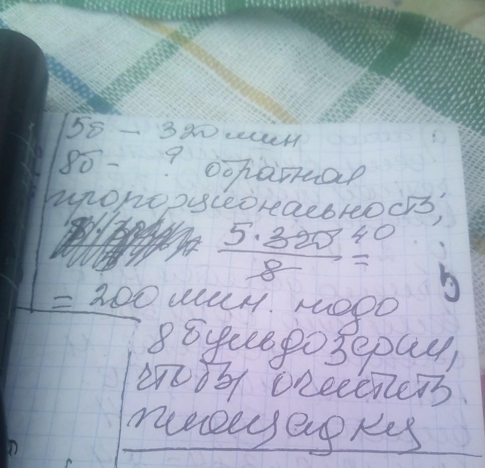 Для строительства стадиона 5 бульдозеров расчистили площадку за 320 мин. За какое время 8 бульдозеров расчистят эту площадку?