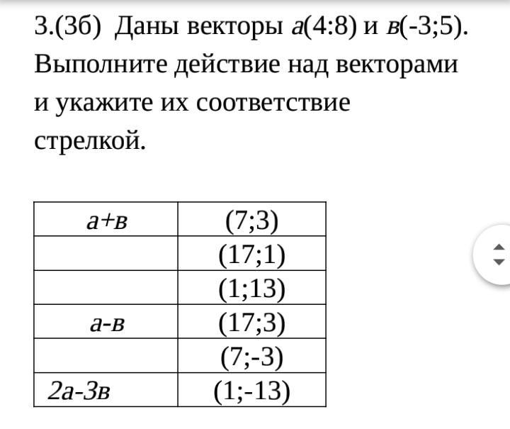 3. Даны векторы а(4:8) и в(-3;5). Выполните действие над векторами и укажите их соответствие стрелкой.