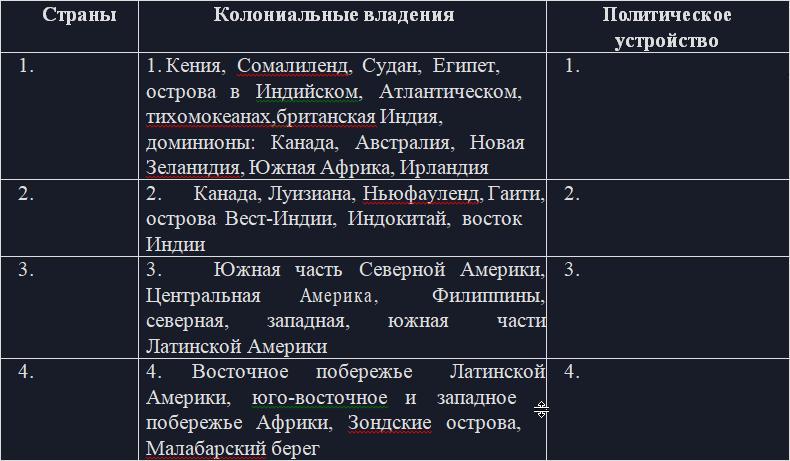 1. Определите метрополии указанных в средней колонке колониальных владений. Укажите политическое устройство стран-метрополий.