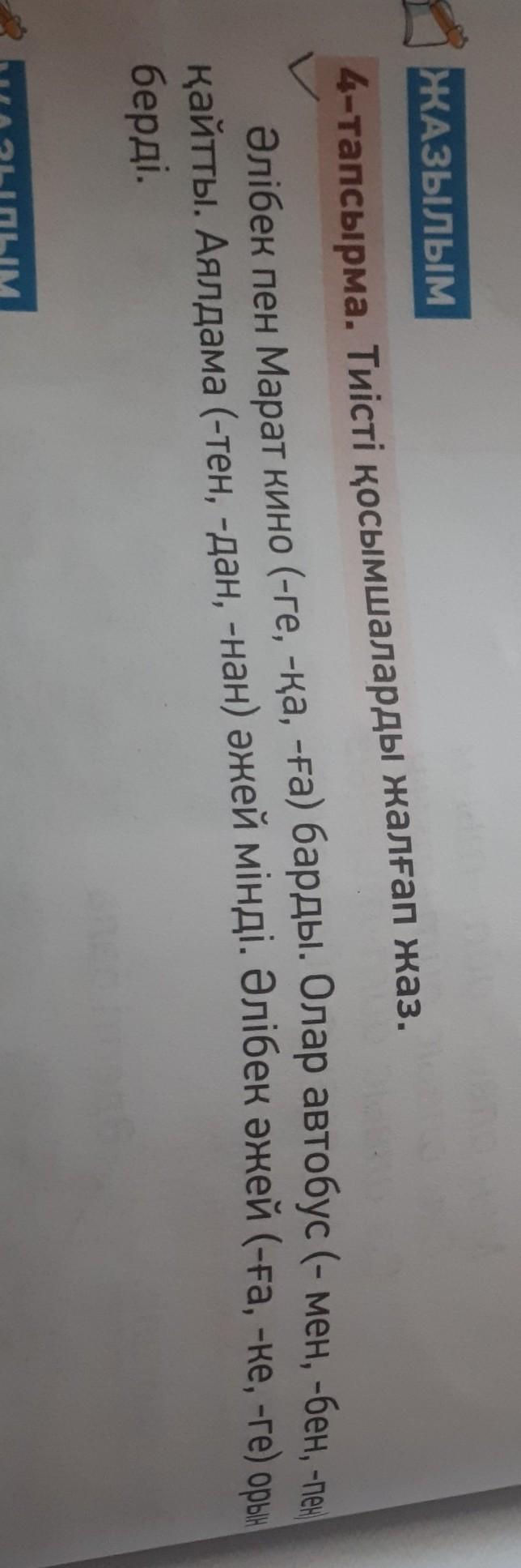 Әлібек пен Марат киноға барды. Олар автобуспен қайтты. Аялдамадан әжей мінді. Әлібек әжейге орын берді.