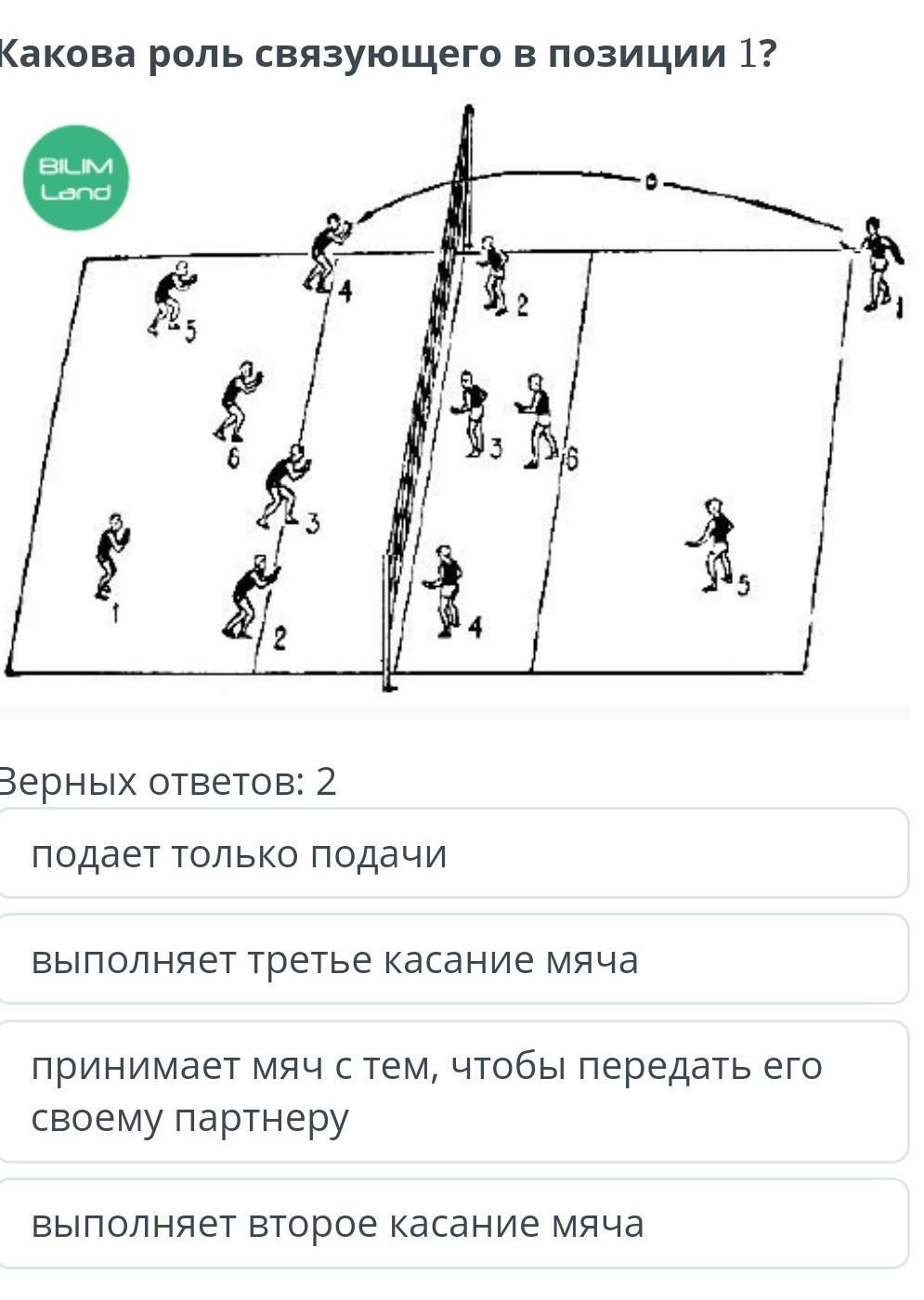 выполняет второе касание мяча. принимает мяч с тем, чтобы передать его своему партнеру