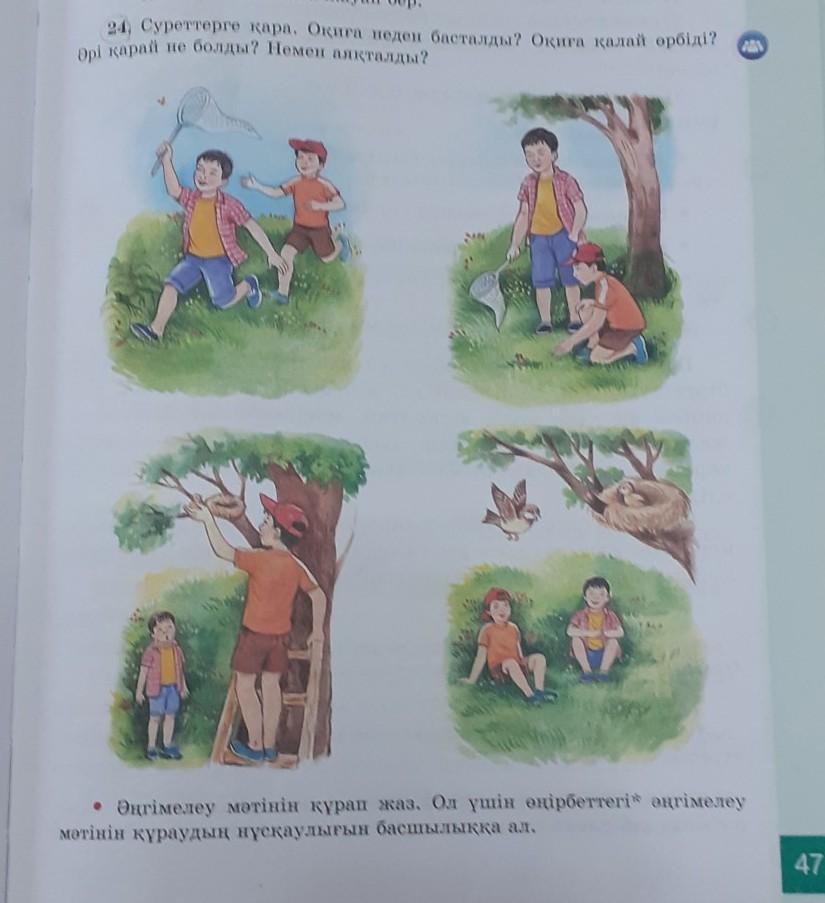 24.Суреттерге қара.Оқиға неден басталды?Оқиға қалай өрбіді?Әрі қарай не болды?Немен аяқталды? Сурет бойынша әңгіме құрап жазу