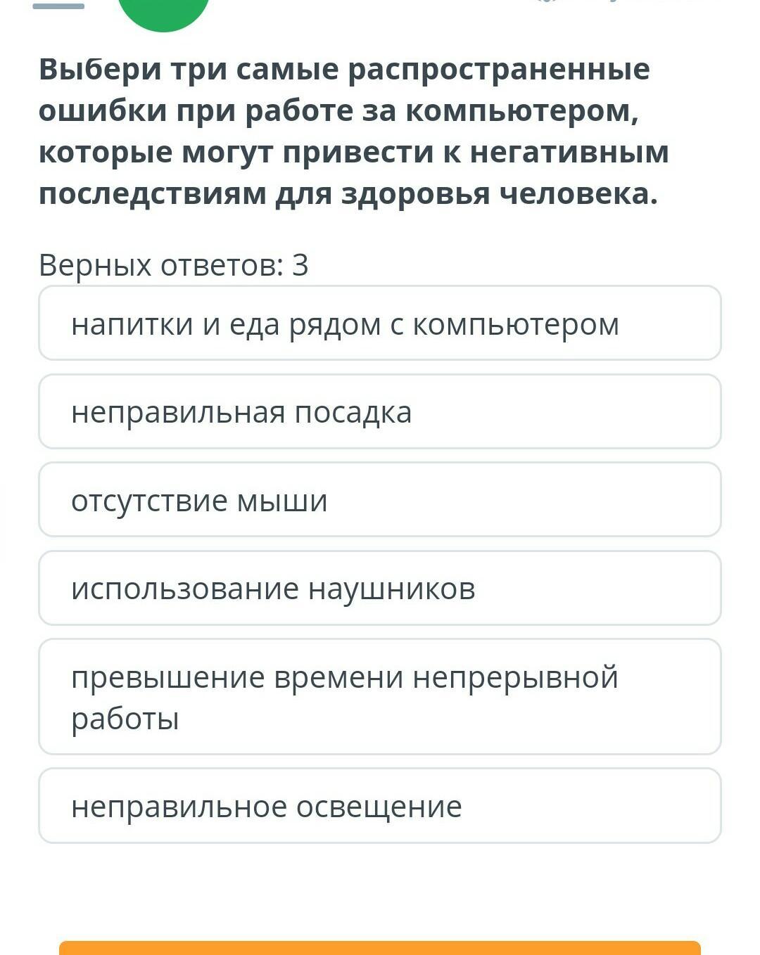 Выбери три самые распространенные ошибки при работе за компьютером, которые могут привести к негативным последствиям для здоровья человека.
