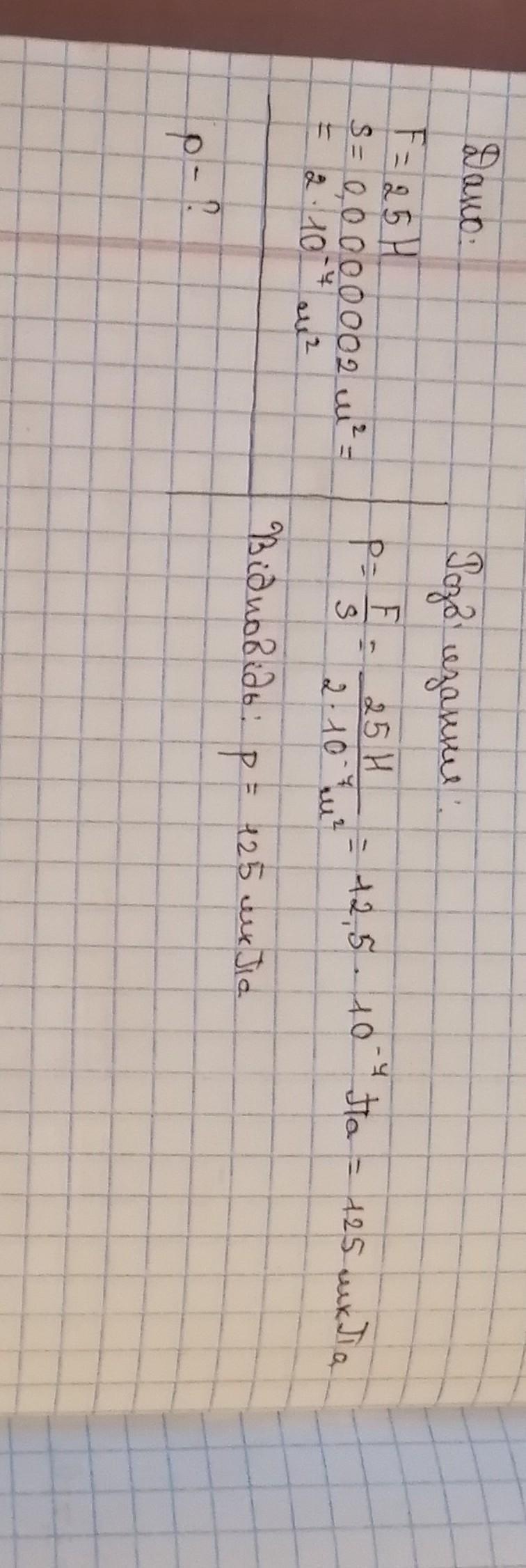 Средняя сила удара молотка по гвоздю составляет 25 Н. Какое давление оказывает забиваемый гвоздь на доску в процессе удара, если площадь поперечного сечения его острия 0,0000002 м2?