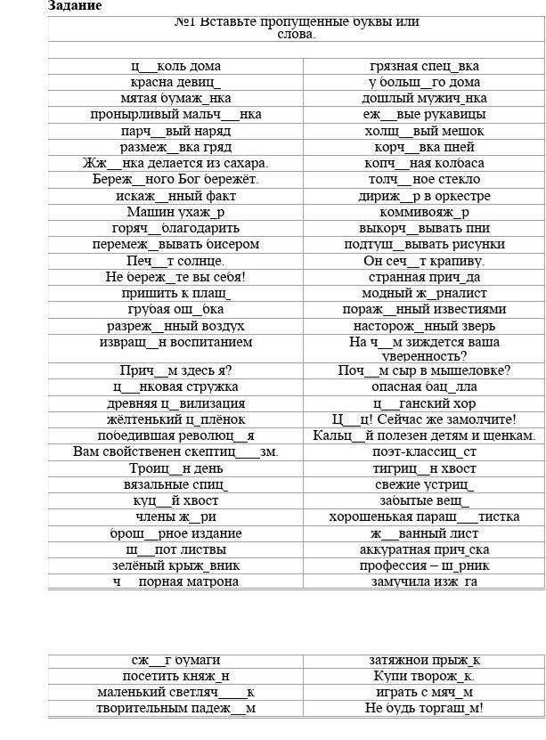 Спецовка,большого, мужичинка,ежевые,холщевый, корчевка,конченая, толченое,дирижёр, коммивояжир, выкорчивать, подтушивать, сечет, причуда, журналист, пораженный, настороженный, чем, почем, цыганский, цыц, кальций, Классисист, тигрицын,устрицы, вещи, парашутистка,изжога