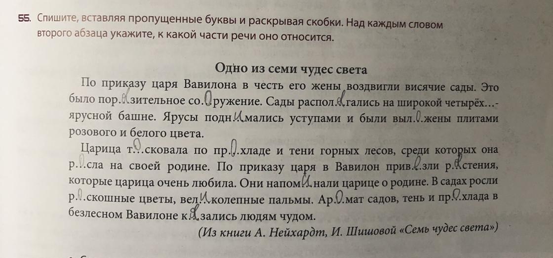 Поразительное - прилагательное; сооружение - существительное; располагались - глагол; четырёхъярусной - прилагательное; поднимались - глагол; выложены - глагол; тосковала - глагол; прохладе - существительное; росла - глагол; привезли - глагол; растения - существительное; напоминали - глагол; роскошные - прилагтельное; великолепные - прилагательное; аромат - существительное; пказались - глагол