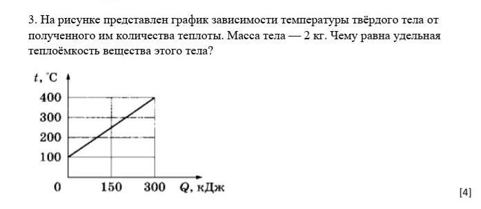 На рисунке представлен график зависимости температуры твёрдого тела от полученного им количества теплоты. Масса тела — 2 кг. Чему равна удельная теплоёмкость вещества этого тела?