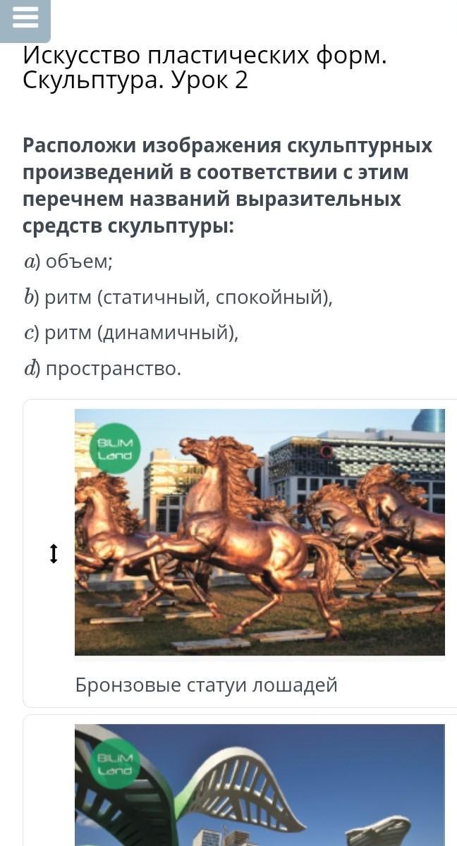 Расположи изображения скульптурных произведений в соответствии с этим перечнем названий выразительных средств скульптуры: