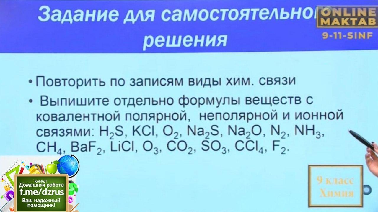 Ковалентная полярная связь (как правило, между 2 разными неметаллами): H2S, NH3, CH4, CO2, SO2, CCl4.